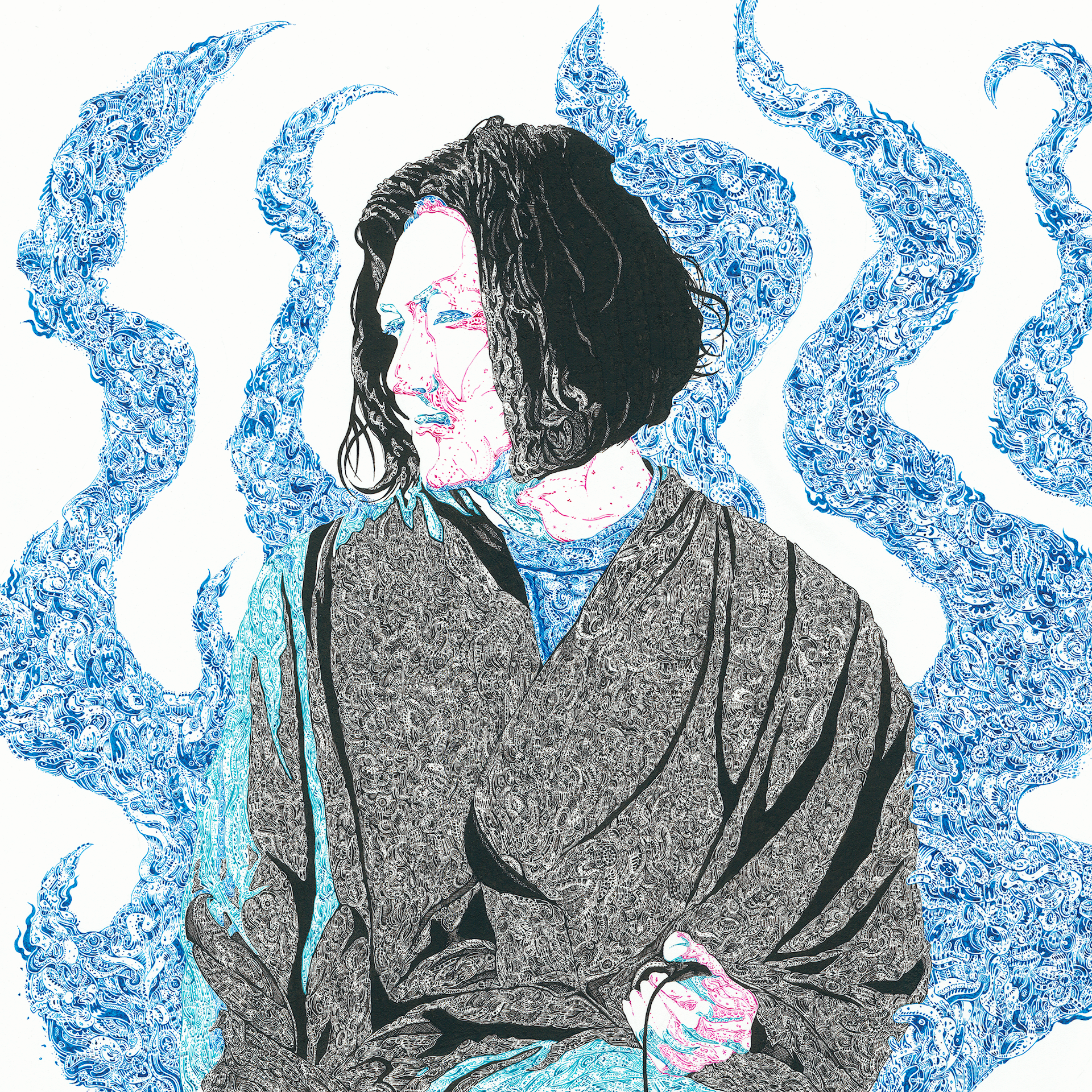 A work created for musician Kawara, Sen’s album Something Like a River Flowing into the Lake—No Exit? Based on a profile photograph, it was drawn while actually listening to the music.